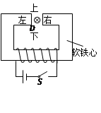 图中的D为置于电磁铁两极间的一段通电直导线,电流方向垂直于纸面向里。在开关S接通后,导线D所受磁场力的方向是 ![]()