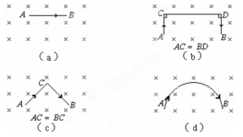 如下图所示,匀强磁场中放着通入相同电流的几段导线(均在纸面内),AB间距离都相等,则受力的情况是:![]()