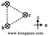 在等边三角形的三个顶点a、b、c处,各有一条长直导线垂直穿过纸面,导线中通有大小相等的恒定电流,方向如图。过c点的导线所受安培力的方向