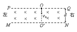 如图所示,一个理想边界为PQ、MN的匀强磁场区域,磁场宽度为d,方向垂直纸面向里。一电子从O点沿纸面垂直PQ以速度v0进入磁场。若电子在磁场中运动的轨道半径为2d。O′在MN上,且OO′ 与MN垂直。下列判断正确的是( )![]()