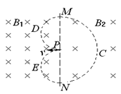 如图所示,两匀强磁场方向相同,以虚线MN为理想边界,磁感应强度分别为B1、B2.今有一个质量为m、电荷量为e的电子从MN上的P点沿垂直于磁场的方向射入匀强磁场B1中,其运动轨迹为如图虚线所示的“心”形图线.则以下说法正确的是( )![]()