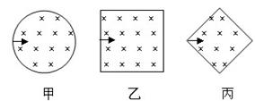 如图所示,甲,乙,丙分别是磁感应强度相同的圆形、正方形、正菱形(倾斜放置的正方形)匀强磁场区域(圆形直径与正方形边长及正菱形对角线长度相同)。相同带电粒子以相同速度沿垂直于磁场方向,对准中心O分别进入三个区域。则粒子分别经过三个磁场区域所用的时间由短到长顺序可能为()。![]()