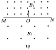 如右图甲所示,以MN为界的两匀强磁场B1=2B2,一带电+q、质量m的粒子从O点垂直MN进入B1磁场,则经过多长时间它将向下通过O点(不计粒子重力) ( )![]()