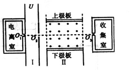 如图所示,一束粒子(不计重力,初速度可忽略)缓慢通过小孔O1进入极板间电压为U的水平加速电场区域I,再通过小孔O2射入相互正交的匀强电场和匀强磁场区域II,其中磁场的方向如图所示,磁感应强度大小可根据实际要求调节,收集室的小孔O3与O1、O2在同一条水平线上.则![]()