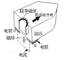 我国第一艘超导电磁推进船HEMS—1已下水试验,它取消了传统的螺旋桨,是船舶推进的重大革新,其原理如图所示,安装在靠近船底部的超导磁体在海水中产生磁场,海水中含有丰富的NaCl成分,导电正负离子Na+、Cl-较多,电导率较高.当电流在垂直于磁场的方向上流过时,就会在与电流方向、磁场方向都垂直的方向上产生推力。强磁场方向竖直向下,在垂直于船身方向,两边安装正负电极,电极浸在海水里,当电源接通时,海水中产生垂直于船体方向的强电流,推动船体运动。如磁感强度为5T,(可看作匀强)水通道宽为1m,产生推动为100N,则船上的电池中,电流为______A。