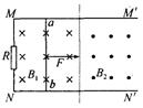 水平放置的光滑导轨MM‵和NN‵间接有电阻R,导轨左右区域分别处于不同方向的匀强磁场中,磁场方向如图所示,磁感应强度分别为B1和B2,虚线为两区域的分界线,一根金属棒ab放在导轨上且与其垂直,金属棒与导轨电阻均不计,金属棒在水平向右的恒力F作用下,经过左、右两区域,已知金属棒在左面区域中恰好做速度为v的匀速运动,则金属棒进入右面区域中,下列说法正确的是![]()