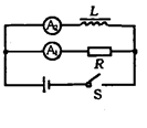 如图所示,电路中,L为一自感线圈,两支路电阻相等,则( ) ![]()
