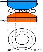 右图是电子感应加速器的示意图,上、下为电磁铁的两个磁极,磁极之间有一个环形真空室,电子在真室室中做圆周运动。上图为侧视图,下图为真空室的俯视图。电子从电子枪右端逸出(不计初速度)后,在真空室中沿虚线被加速,然后击中电子枪左端的靶,下列说法正确的是![]()