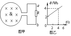 一线圈匝数为n="10匝,线圈电阻不计,在线圈外接一个阻值R" = 2.0Ω的电阻,如图甲所示。线圈内有垂直纸面向里的磁场,线圈内磁通量φ随时间t变化的规律如图乙所示。下列说法正确的是:( )