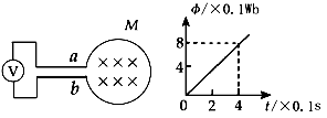 如图所示,一个匝数为50匝的圆形线圈M,它的两端点a、b与内阻很大的电压表相连,线圈中磁通量的变化规律如图所示,则ab两点的电势高低与电压表读数正确的为![]()