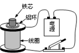 绕有线圈的铁芯直立在水平桌面上,铁芯上套着一个铝环,线圈与电源、电键相连,如图所示.线圈上端与电源正极相连,闭合电键的瞬间,铝环向上跳起.若保持电键闭合,则( )![]()
