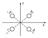 如图所示,沿x轴?y轴有两根长直导线,互相绝缘.x轴上的导线中有-x方向的电流,y轴上的导线中有+y方向的电流,两虚线是坐标轴所夹角的角平分线.a?b?c?d是四个圆心在虚线上?与坐标原点等距的相同的圆形导线环.当两直导线中的电流从相同大小,以相同的快慢均匀减少时,各导线环中的感应电流情况是( )![]()