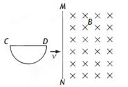 如图所示,一导线弯成半径为a的半圆形闭合回路。虚线MN右侧有磁感应强度为B的匀强磁场,方向垂直于回路所在的平面。回路以速度v向右匀速进入磁场,直径CD始络与MN垂直。从D点到达边界开始到C点进入磁场为止,下列结论正确的是 ( )![]()