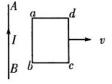 如图所示,导线框abcd与固定直导线AB在同一平面内,直导线AB中通有恒定电流I,当线框由图示位置向右匀速运动的过程中 ( )![]()