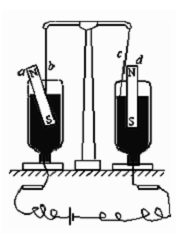 物理学家法拉第在研究电磁学时,亲手做过许多实验,如右图所示的就是著名的电磁旋转实验.它的现象是:如果载流导线附近只有磁铁的一个极,磁铁就会围绕导线旋转;反之,载流导线也会围绕单独的某一磁极旋转.这一装置实际上就是最早的电动机.图中a是可动磁铁,b是固定导线,c是可动导线,d是固定磁铁.图中黑色部分表示汞,下部接在电源上,则从上向下看,a、c旋转的情况是![]()