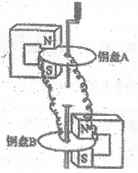 在如图所示的实验装置中,处在磁极间的A盘和B盘分别是两个可绕不同固定转轴灵活转动的铜盘,实验时用一根导线与A盘的中心和B盘的边缘接触,用另一根导线与B盘的中心和A盘的边缘接触。摇动摇把,A盘顺时针转动(从上往下看)起来后 ![]()