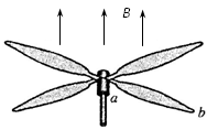 一直升飞机停在南半球的地磁极上空。该处地磁场的方向竖直向上,磁感应强度为B。直升飞机螺旋桨叶片的长度为l,螺旋桨转动的频率为f,顺着地磁场的方向看螺旋桨,螺旋桨按顺时针方向转动。螺旋桨叶片的近轴端为a,远轴端为b,如图所示。如果忽略a到转轴中心线的距离,用ε表示每个叶片中的感应电动势,则![]()