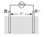 南半球海洋某处,地磁场水平分量B1=0.8×10-4T,竖直分量B2=0.5×10-4T,海水向北流动。海洋工作者测量海水的流速时,将两极板竖直插入此处海水中,保持两极板正对且垂线沿东西方向,两极板相距L=10m,如图所示。与两极板相连的电压表(可看作理想电压表)示数为U=0.2mV,则( )![]()