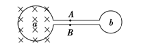 如图所示,圆环a和b的半径之比为r1∶r2=2∶1,且都是由粗细相同的同种材料的导线构成,连接两环的导线电阻不计,匀强磁场的磁感应强度始终以恒定的变化率变大,那么,当只有a环置于磁场中与只有b环置于磁场中两种情况下,A、B两点的电势差之比为( )![]()