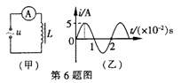 如图甲所示电路中,电感为L的线圈与电流表A串联后接在交流电源上,当电路中通过如图乙所示正弦式交变电流时,下列说法中正确的是![]()