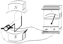 如图所示,矩形线圈abcd在匀强磁场中沿逆时针方向匀速转动,可产生交流电.当线圈转到图示位置时,电流表指针偏向右方,当线圈由图示位置继续转动,下列说法中正确的是 ( )![]()