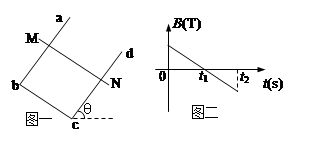 如图一所示,abcd为用导体做成的框架,其所在平面与水平面成θ角,质量为m的导体棒MN与ab、cd接触良好,回路的电阻为R,整个装置放于垂直于框架平面的变化的磁场中,t=0时磁场方向向上。磁感应强度B的变化情况如图二所示,MN始终静止。则在0~t2时间段内,下面的分析正确的是( )![]()