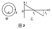 如图2甲所示,两个闭合圆形线圈a、b的圆心重合,放在同一个水平面内,线圈b中通以如图2乙所示的电流,设t=0时b中的电流沿逆时针方向(如图2甲中箭头所示),则线圈a在0一t2时间内![]()
