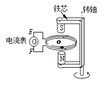 一种早期发电机原理示意图如图所示,该发电机由固定的圆形线圈和一对用铁芯连接的圆柱形磁铁构成,两磁极相对于线圈平面对称,线圈圆心为