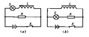 如图所示的电路(a)和(b)中,电阻R和自感线圈L的电阻相等且都较小,接通K使电路中的电流达到稳定时,灯泡S发光,则 ( )![]()