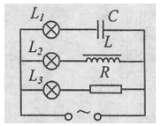 如图所示,当交流电源的电压为220 V,频率为50 Hz时,三只灯泡,L1、L2、L3亮度相同。若保持交流电源的电压不变,只将其频率变为100 Hz,则 ( )![]()