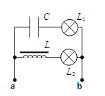 两个相同的白炽灯泡L1和L2接到如图所示的电路中,灯L1与电容器串联,灯L2与电感线圈串联.当a、b间接电压最大值为Um、频率为f的正弦交流电源时,两灯都发光,且亮度相同.在a、b间更换一个新的正弦交流电源后,灯L1的亮度低于灯L2的亮度。新电源的电压最大值和频率可能是:![]()
