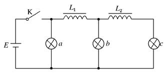 如图所示的电路中,三个相同的灯泡a?b?c和电感L1?L2与直流电源连接,电感的电阻忽略不计.电键K从闭合状态突然断开时,下列判断正确的有( )![]()