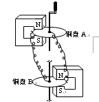 如图所示是世界上早期制作的发电机及电动机的实验装置,A盘和B盘分别是两个可绕固定转轴转动的铜盘,实验时用导线将A盘的中心和B盘的边缘连接起来,用另一根导线将B盘的中心和A盘的边缘连接起来.当A盘在外力作用下转动起来时,B盘也会转动。则下列说法中正确的是 [ ]![]()