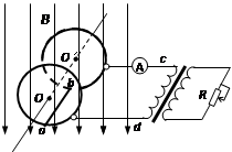 如图所示,导体棒ab两个端点分别搭接在两个竖直放置、电阻不计、半径相等的金属圆环上,圆环通过电刷与导线c、d相接,c、d两个端点接在匝数比5:1(左边比右边)的理想变压器圈两端,变压器副线圈接一滑动变阻器,匀强磁场的磁感应强度为B,方向竖直向下。设导体棒ab长为L(电阻不计),并绕与ab平行的水平轴(也是两圆环的中心轴)OO'以角速度ω匀速转动。当变阻器的阻值为R时,通过电流表的电流为I,则( )![]()