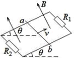 如图所示,平行金属导轨与水平面成θ角,导轨与固定电阻R1和R2相连,匀强磁场垂直穿过导轨平面.有一导体棒ab,质量为m,导体棒的电阻与固定电阻R1和R2的阻值均相等,与导轨之间的动摩擦因数为μ,导体棒ab沿导轨向上滑动,当上滑的速度为v时,受到安培力的大小为F。此时,![]()