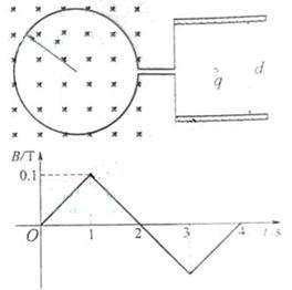 半径为r带缺口的刚性金属圆环在纸面上固定放置,在圆环的缺口两端引出两根导线,分别与两块垂直于纸面固定放置的平行金属板连接,两板间距为d,如图(上)所示。有一变化的磁场垂直于纸面,规定向内为正,变化规律如图(下)所示。在t=0时刻平板之间中心有一重力不计,电荷量为q的静止微粒,则以下说法正确的是![]()