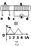 某同学在实验室里将一磁铁放在转盘上,如图甲所示,磁铁可随转盘转动,另将一磁感应强度传感器固定在转盘旁边,当转盘(及磁铁)转动时,引起磁感应强度测量值周期性地变化,该变化与转盘转动的周期一致。经过操作,该同学在计算机上得到了如图乙所示的图象。该同学猜测磁感应强度传感器内有一线圈,当测得磁感应强度最大时就是穿过线圈的磁通量最大时。按照这种猜测,下列说法正确的是:( )![]()