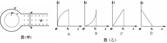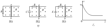 图甲中的三个装置均在水平面内且处于竖直向下的匀强磁场中,足够长的光滑导轨固定不动,图2中电容器不带电。现使导体棒ab以水平初速度v0向右运动,导体棒ab在运动过程中始终与导轨垂直,且接触良好。某同学定性画出了导体棒ab的v-t图像,如图乙所示。则他画出的是( )![]()