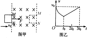如图甲所示,光滑水平面上有一个单匝均匀正方形铜线框,钱框质量为m,边长为a,总电阻为R.垂直于水平面的有界匀强磁场磁感应强度为B,磁场左、右边界相互平行,相距为b(b>3a).线框的MN边与磁场边界平行.在垂直于MN的水平恒力F作用下线框水平向右运动,t=0时MN边以速度v0进入磁场,t=t0时线框完全进入磁场,t=3t0时线框MN边以速度v0离开磁场.v-t图象如图乙所示.![]()