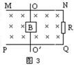 如图3所示,MN、PQ为互相平行的金属导轨与电阻R相连.粗细均匀的金属线框用Oa和O′b金属细棒与导轨相接触,整个装置处于匀强磁场中,磁感强度B的方向垂直纸面向里.当线框OO′轴转动时 ![]()