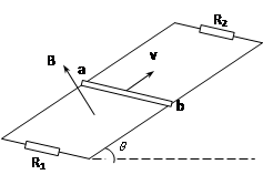 角,导轨和定值电阻R1和R2相连,匀强磁场垂直穿过导轨平面,有一质量为m的导体棒ab,电阻与固定电阻R1和R2阻值均相等,导体棒和导轨间的动摩擦因数为
