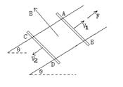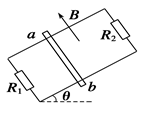 如图所示,平行金属导轨与水平面成θ角,导线与固定电阻R1和R2相连,匀强磁场垂直穿过导轨平面.有一导体棒ab,质量为m,长度为L,导体棒的电阻与固定电阻R1和R2的阻值相等,都等于R,导体棒与导轨之间的动摩擦因数为μ,导体棒ab沿导轨向上滑动,当上滑的速度为v时,有![]()