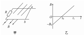 如图甲所示,MN左侧有一垂直纸面向里的匀强磁场.现将一边长为l、质量为m、电阻为R的正方形金属线框置于该磁场中,使线框平面与磁场垂直,且bc边与磁场边界MN重合.当t= 0时,对线框施加一水平拉力F,使线框由静止开始向右做匀加速直线运动;当t = t0时,线框的ad边与磁场边界MN重合.图乙为拉力F随时间变化的图线,不计摩擦阻力.由以上条件可知,磁场的磁感应强度B的大小和感应电流方向分别为![]()