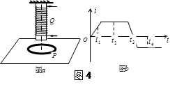 如图所示,圆形线圈P静止在水平桌面上,其正上方悬挂另一个线圈Q,P与Q共轴,Q中通有变化电流,电流随时间变化的规律如图4b所示,P所受的重力为G,桌面对P的支持力为N,则( )![]()