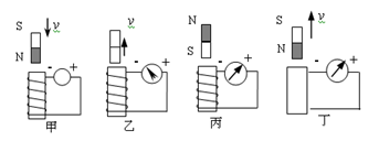已知一灵敏电流计,当电流从正接线柱流入时,指针向正接线柱一侧偏转,现把它与线圈串联接成下图所示电路,当条形磁铁按如图所示情况运动时,以下判断正确的是:( )![]()