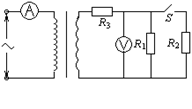 如图所示,理想变压器原线圈接在电压有效值不变的正弦交流电源上,副线圈向电阻R1、R2和R3供电, A为交流电流表,V为交流电压表,开关S闭合后与闭合前相比( )![]()