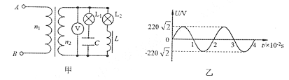 ,L1和L2是相同型号的白炽灯,L1与电容器C串联,L2与带铁芯的线圈L串联,V为交流电压表。当原线圈接有如图乙所示正弦交变电压时,两只灯泡的亮度相同,则 ( )![]()