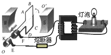 T的水平匀强磁场中,线框面积S=0.5m2,线框电阻不计。线框绕垂直于磁场的轴OO′以角速度ω=200rad/s匀速转动,并与理想变压器原线圈相连,副线圈线接入一只“220V,60W”灯泡,且灯泡正常发光,熔断器允许通过的最大电流为10A,下列说法正确的是:![]()