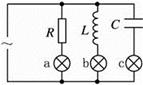 如图所示,电路中三个完全相同的灯泡a、b和c分别与电阻R、电感L和电容C串联,当电路两端接入电压为u=220sin100πt V的交变电压,三个灯泡亮度恰好相同。若保持交变电压大小不变,将频率增大到60Hz,则将发生的现象是![]()