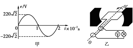 一台小型发电机产生的电动势随时间按正弦变化的规律如图甲所示。已知发电机线圈内阻为5.0 Ω,现外接一只电阻为95.0 Ω的灯泡,如图乙所示,则